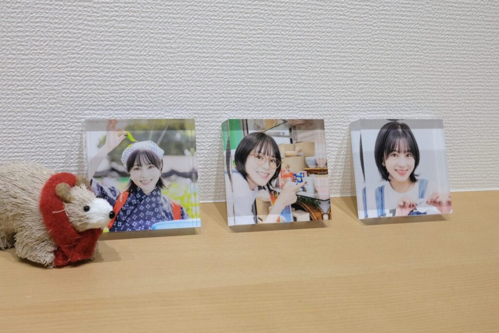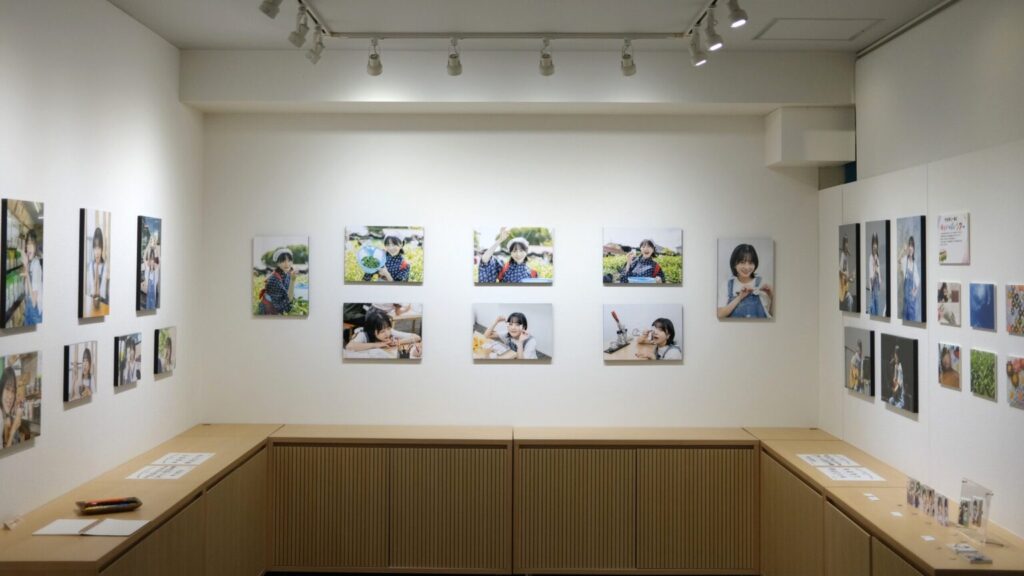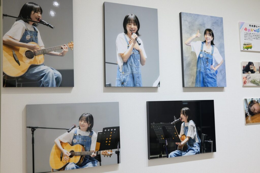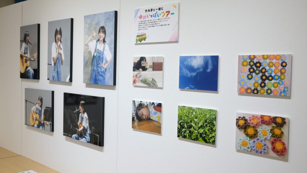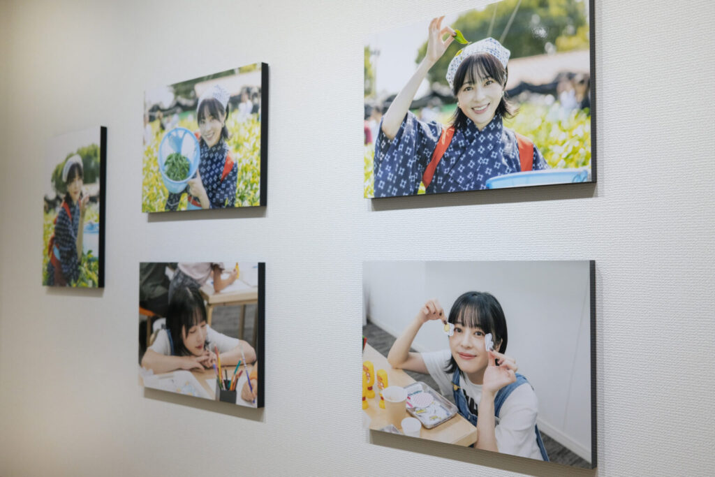竹内さんの茶摘み体験や、ワークショップ、弾き語りライブなどツアー中の様子がA3、A4サイズのWALL DECORで展示されました。ツアーの様子を大きなサイズにプリントして見てもらうことで、参加されなかった方にも竹内さんの明るい表情や雰囲気を伝えることができ、皆さまが楽しめる展示なりました。またプロのカメラマンの撮影の作品のほかに、竹内さんご自身が撮影した作品も展示され、竹内さん視点でのツアーの様子も伺えました。