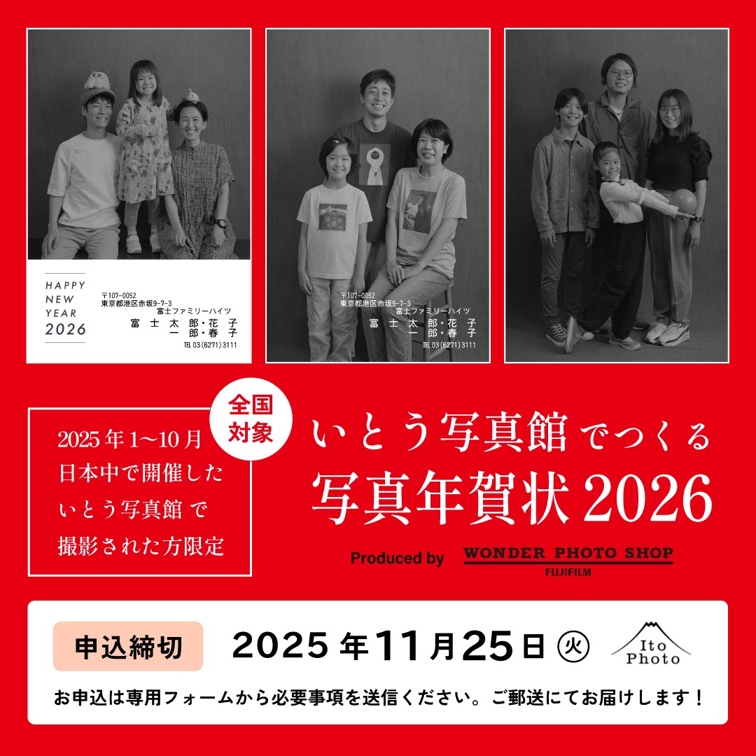 今まで当店で撮影の方限定で、いとう写真館で撮影した写真を使って年賀状を作るサービスをご案内しておりましたが、このたび2025年1月~10月上旬に いとう写真館で撮影した全国のみなさまに、当店の写真年賀状サービスをご注文いただけることとなりました!