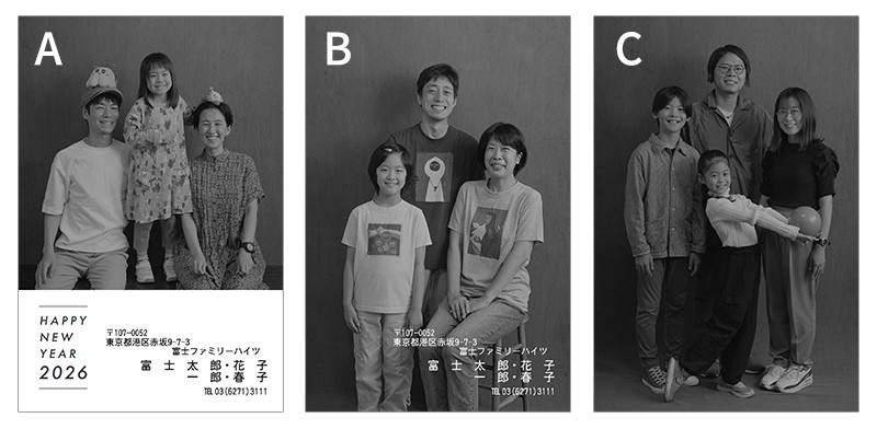 年賀状のデザインは、写真が映えるシンプルなテンプレート3種類からお選びいただけます。