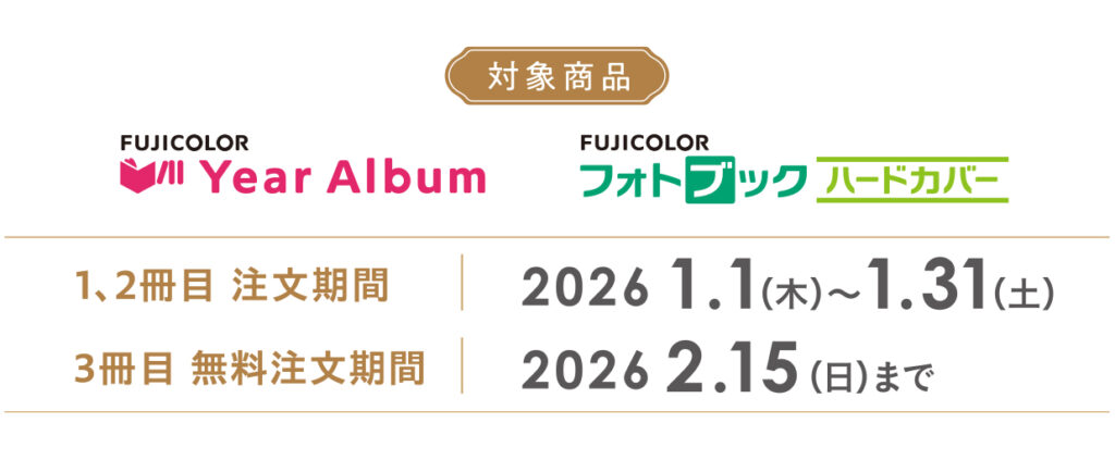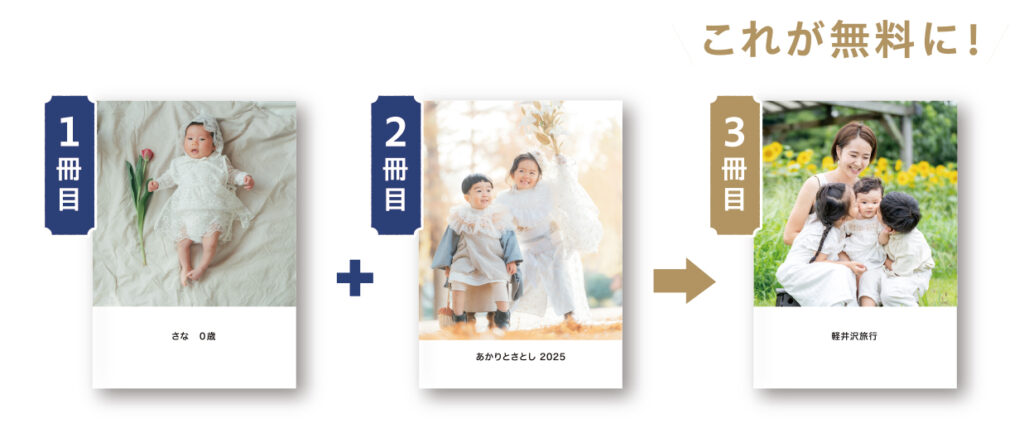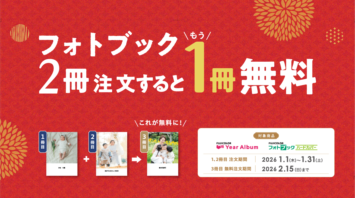 対象のフォトブックを1冊ご注文ごとに、店頭にて配布しておりますスタンプカードに1個押印いたします。2個溜まれば1冊無料でおつくりいただけます。1冊ごとに別々の注文や、無料分の3冊目を同時に注文いただくことも可能です。