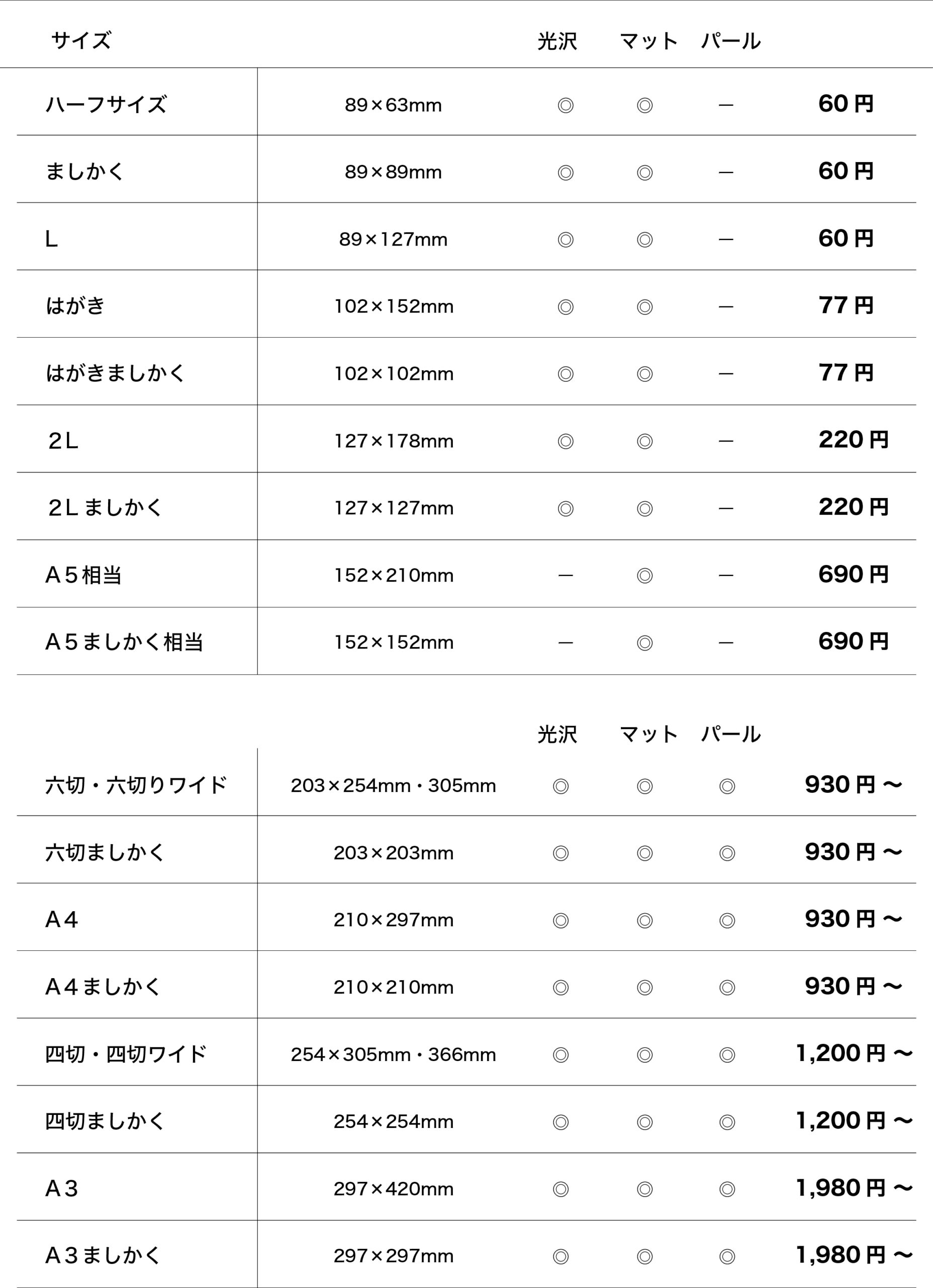 - 「六切サイズ」〜「A3サイズ」で「パール」「ラスター」を選んだ場合、上記に+110円追加料金がかかります。